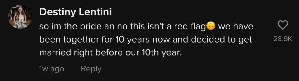 Bride Destiny responded to the discussions by clarifying, “So [I'm] the bride an no this isn't a red flag... we have been together for 10 years now and decided to get married right before our 10th year.”