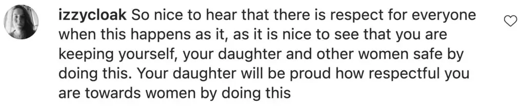 A third commented: "So nice to hear that there is respect for everyone when this happens as it, as it is nice to see that you are keeping yourself, your daughter and other women safe by doing this. Your daughter will be proud how respectful you are towards women by doing this."