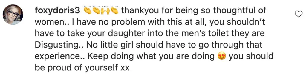 One person commented: "thank you for being so thoughtful of women.. I have no problem with this at all, you shouldn’t have to take your daughter into the men’s toilet they are Disgusting.. No little girl should have to go through that experience.. Keep doing what you are doing [...] you should be proud of yourself".