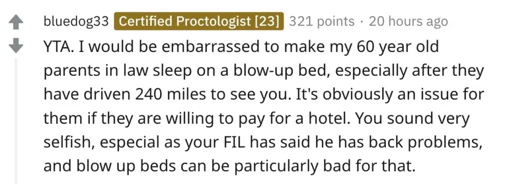 One Redditor flat-out stated that the husband is in the wrong, writing: "[Yes, the a**hole]. I would be embarrassed to make my 60-year-old parents in law sleep on a blow-up bed, especially after they have driven 240 miles to see you.