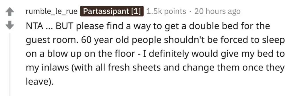 One Redditor wrote: "[Not the a**hole] ... BUT please find a way to get a double bed for the guest room. 60-year-old people shouldn't be forced to sleep on a blow up on the floor - I definitely would give my bed to my inlaws."