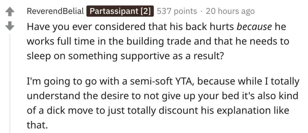 "I'm going to go with a semi-soft YTA, because while I totally understand the desire to not give up your bed it's also kind of a dick move to just totally discount his explanation like that."