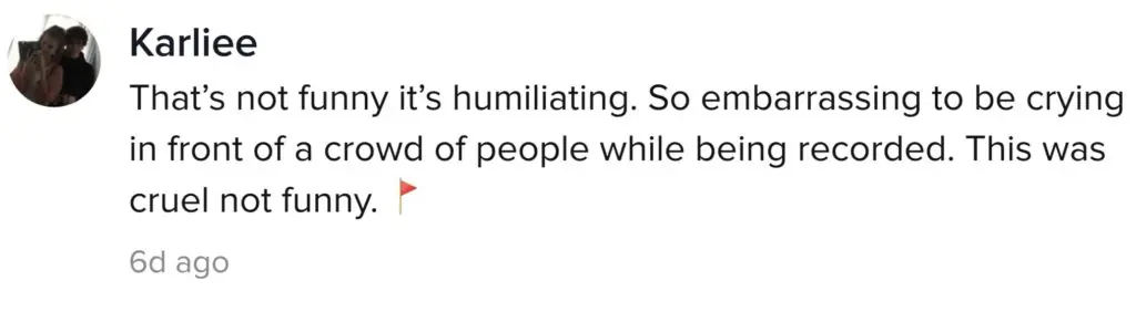 A fourth concerned TikTok user wrote: "That's not funny it's humiliating. So embarrassing to be crying in front of a crowd of people while being recorded. This was cruel not funny." The post was then ended with a "red flag" emoji.