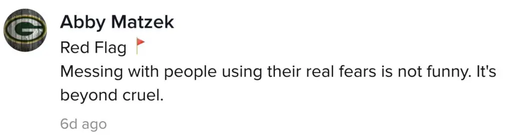 User Abby Matzek echoed the comment above, writing: "Red Flag [...] Messing with people using their fears is not funny. It's beyond cruel."