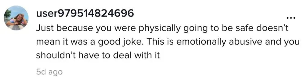 As a second user added: "Just because you were physically going to be safe doesn't mean it was a good joke. This is emotionally abusive and you shouldn't have to deal with it."
