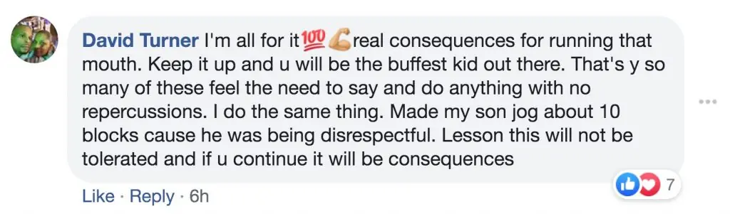 Facebook user David Turner commented: "I'm all for it [...] real consequences for running that mouth. Keep it up and u will be the buffest kid out there. That's [why] so many of these feel the need to say and do anything with no repercussions. I do the same thing. Made my son jog about 10 blocks cause he was being disrespectful. Lesson this will not be tolerated and if u continue it will be consequences [sic]"