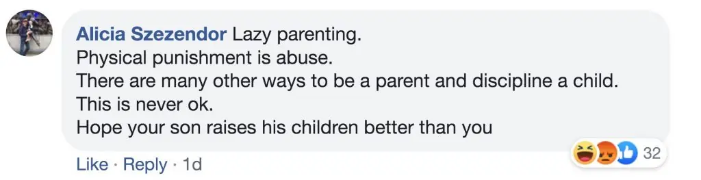 Another Facebook user, Alicia Szezendor, wrote: "Lazy parenting. Physical punishment is abuse. There are many other ways to be a parent and discipline a child. This is never ok. Hope your son raises his children better than you"