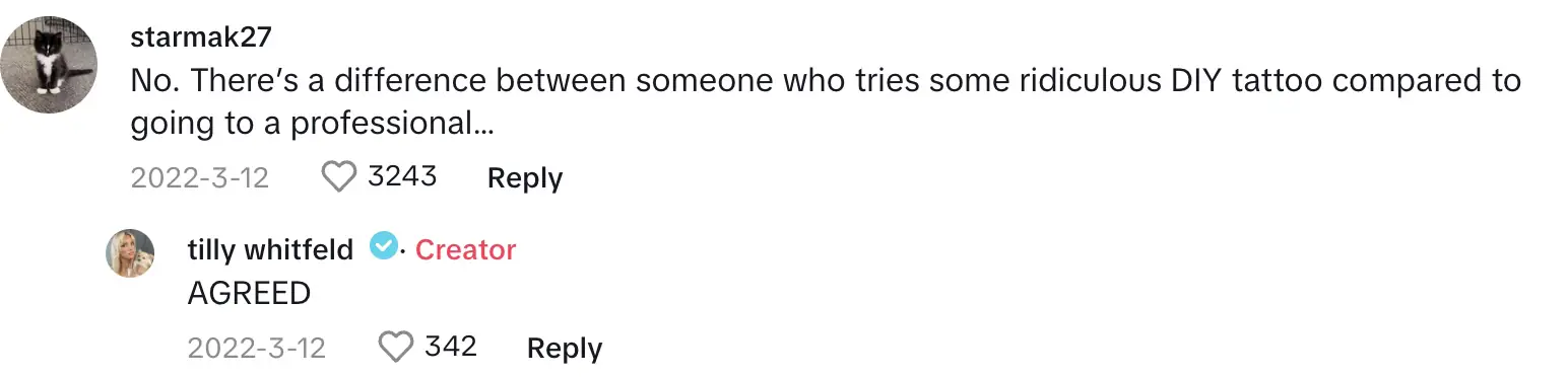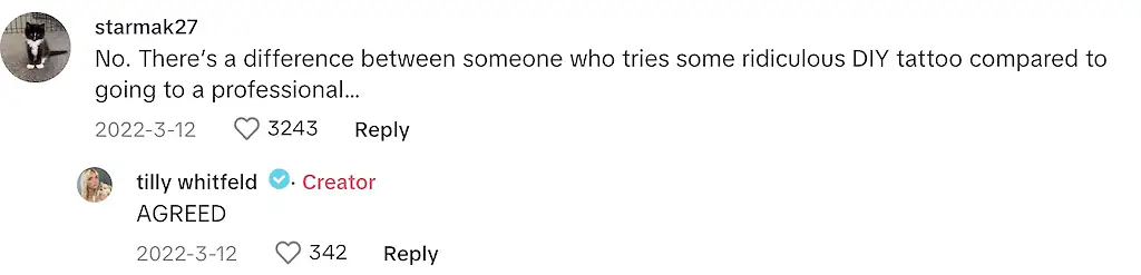 "There’s a difference between someone who tries some ridiculous DIY tattoo compared to going to a professional," one person wrote, as Tilly replied: "AGREED."