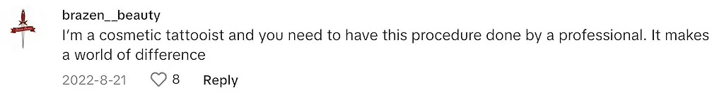 Another comment simply offered the advice: "I’m a cosmetic tattooist and you need to have this procedure done by a professional. It makes a world of difference."