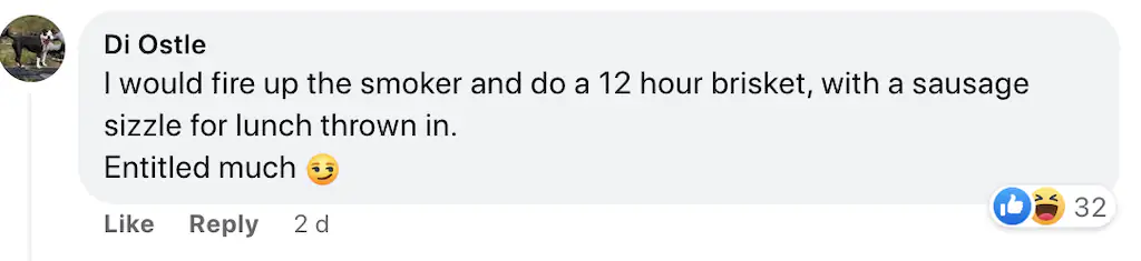 One person quipped: "I would fire up the smoker and do a 12-hour brisket, with a sausage sizzle for lunch thrown in.