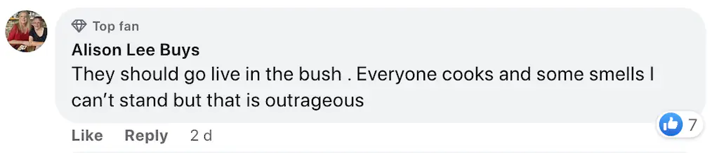 Another user interjected: "They should go live in the bush. Everyone cooks and some smells I can’t stand but that is outrageous."