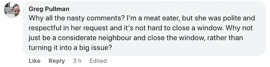 Credit: FacebookMeanwhile, others thought the request was courteous and reasonable as one person stated: "Why all the nasty comments? I'm a meat eater, but she was polite and respectful in her request and it's not hard to close a window. Why not just be a considerate neighbor and close the window, rather than turning it into a big issue?"
