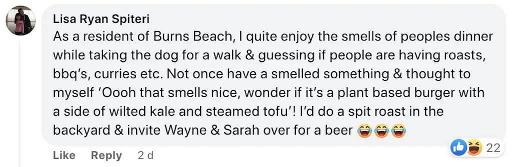 A third person commented: "As a resident of Burns Beach, I quite enjoy the smells of peoples dinner while taking the dog for a walk & guessing if people are having roasts, bbq’s, curries etc...I’d do a spit roast in the backyard & invite Wayne & Sarah over for a beer."