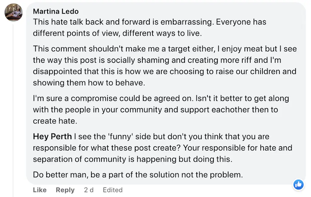"This hate talk back and forward is embarrassing. Everyone has different points of view, different ways to live," he wrote. "I enjoy meat but I see the way this post is socially shaming and creating more riff and I’m disappointed that this is how we are choosing to raise our children and showing them how to behave."