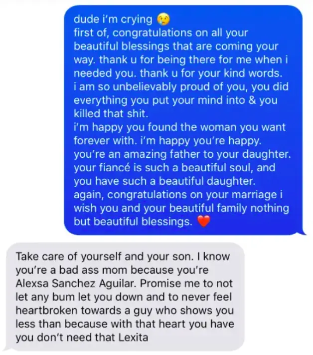 Alexsa felt emotional when she received the heartfelt message and even told her ex she was crying. She congratulated the happy pair and told her former flame how proud of him she was.