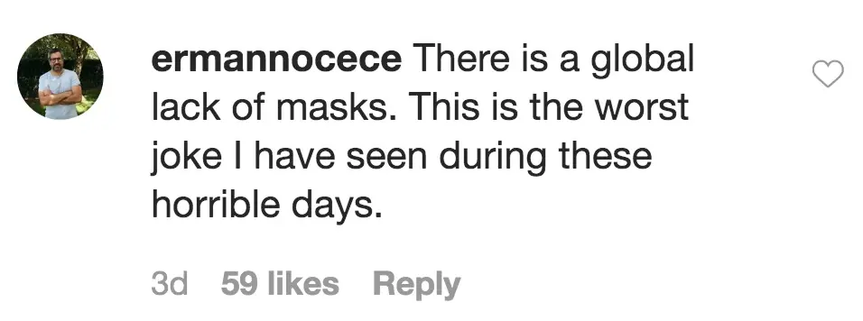 "There is a global lack of masks. This is the worst joke I have seen during these horrible days," one Instagrammer wrote, according to The Sun.