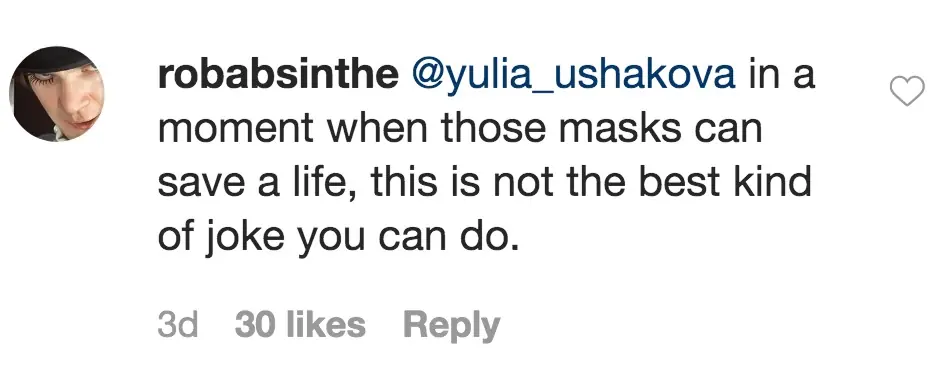 At the time of writing, the photo has managed to rack up 9,655 likes on the photo-sharing platform. But it wasn't long before users began calling Yulia out for being insensitive towards those who have been seriously affected by the pandemic.