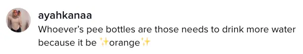 Yet another user was concerned about the color of the urine in the bottles, writing: "Whoever's pee bottles are those needs to drink more water because it be orange [sic]."