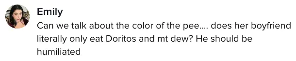 One TikTok user named Emily wrote: "Can we talk about the color of the pee... does her boyfriend literally only eat Doritos and mountain dew? He should be humiliated."