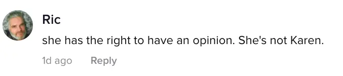Another person said the woman "has the right to have an opinion. She's not Karen."