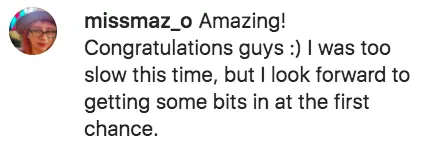 A third person wrote: "Amazing! Congratulations guys - I was too slow this time, but I look forward to getting some bits in at the first chance."
