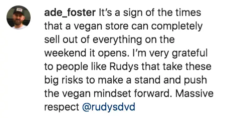 Another user gushed: "It’s a sign of the times that a vegan store can completely sell out of everything on the weekend it opens. I’m very grateful to people like Rudys that take these big risks to make a stand and push the vegan mindset forward. Massive respect @rudysdvd."