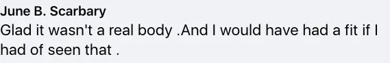 One Facebook user named June B. Scarbary wrote: "Glad it wasn't a real body. And I would have had a fit if I had of [sic] seen that."
