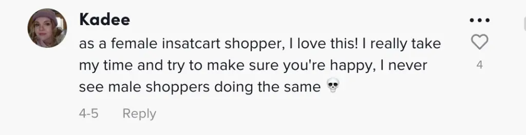 A female Instacart shopper commented: "As a female Instacart shopper, I love this! I really take my time and try to make sure you're happy, I never see male shoppers doing the same."