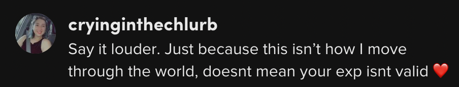 "Say it louder. Just because this isn't how I move through the world, doesn't mean your [experience] isn't valid [...]," another comment read.