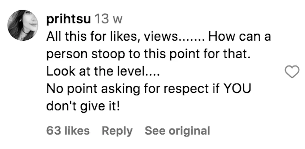 Another person said: "All this for likes, views....... How can a person stoop to this point for that? Look at the level....No point asking for respect if YOU don't give it!"