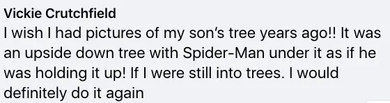 In response, one user named Vickie Crutchfield shared: "I wish I had pictures of my son’s tree years ago!! It was an upside down [sic] tree with Spider-Man under it as if he was holding it up! If I were still into trees. I would definitely do it again."