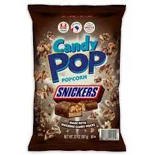 “Candy Pop Snickers popcorn is taking snacking innovation to the next level. Candy Pop is the first popcorn to combine drizzled flavor with real candy pieces. Candy pop is partnering with the renowned Snickers brand and giving customers two of their favorite snacks snickers candy and popcorn. Snickers Candy Pop is a lightly seasoned popcorn that is drizzled with caramel and then covered with ground up snickers candy and nuts.”