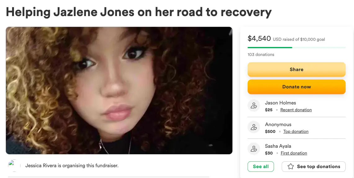 A GoFundMe page has been created in order to raise funds to help Jones recover, and it states that: " [She will] go through life through one eye and live with bullets in her neck and head."