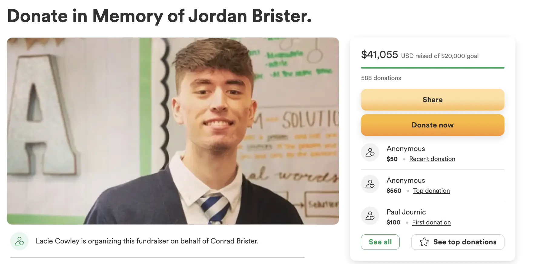 "Jordan Tyler Brister suddenly and unexpectedly suffered cardiac arrest while at school with no explanation as to why," the description read on the fundraiser.