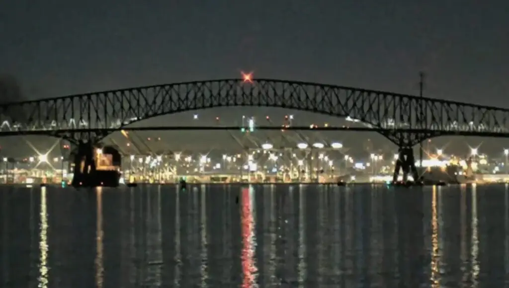 Video footage capturing the collision vividly portrays the ship's impact on the bridge's support column, triggering a rapid collapse of sections into the river below. Plumes of smoke and fire billowed into the air as the bridge succumbed to the force of the collision, with remnants engulfed in flames.