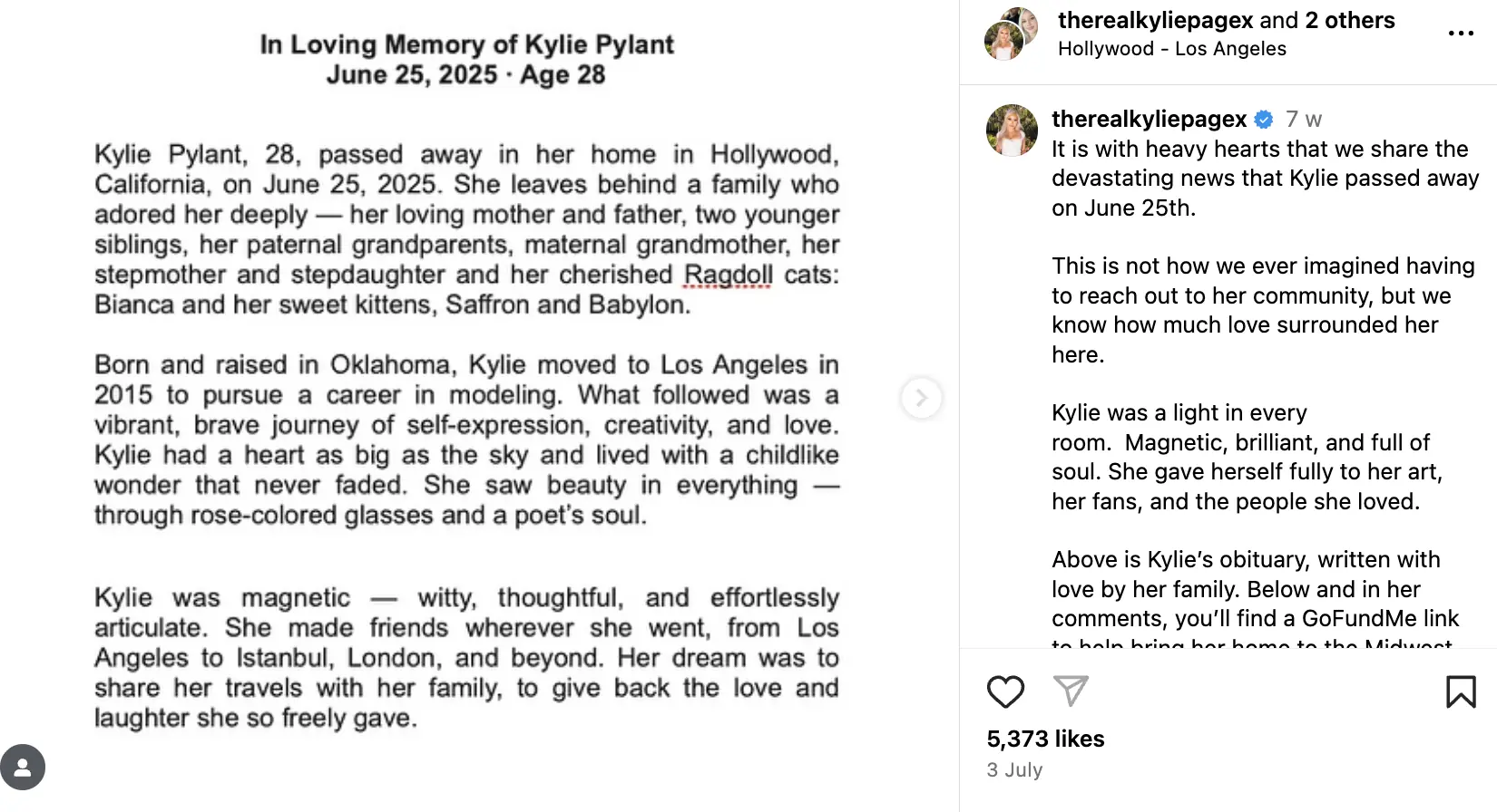 Her agency, Hussie Models, also issued a statement through spokesperson Alex Mack: “Losing Kylie is truly heartbreaking. She was a kind soul, a wonderful friend, and always brought warmth and energy wherever she went. That’s exactly how I’ll always remember her, full of life and kindness.”