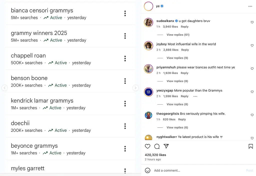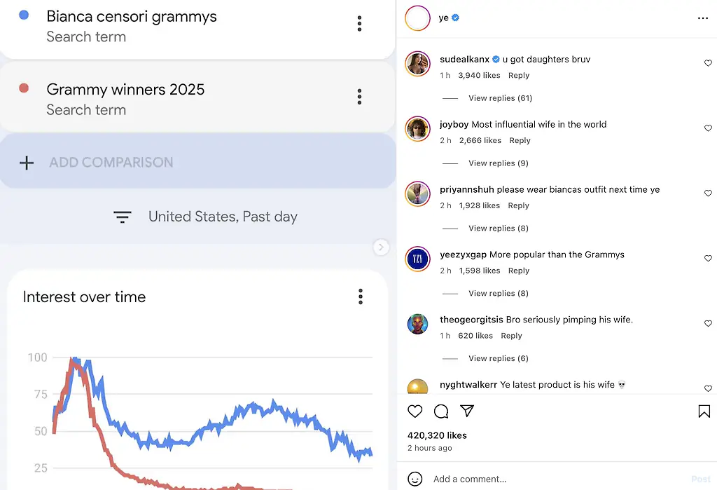 As well as making headlines across the globe, Ye has also shared statistics from Google Trends showing just how many people have been searching for Censori's Grammys look on Google: