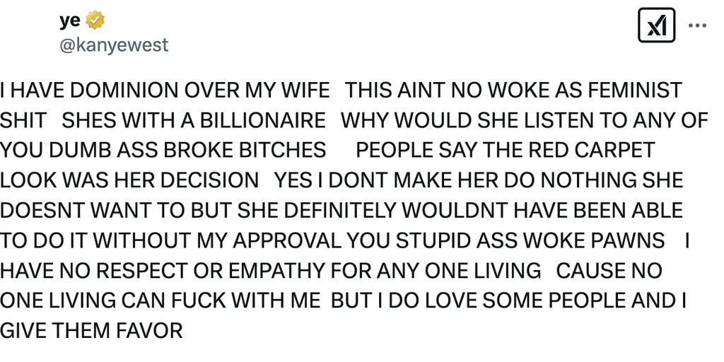 In addition to the hateful tweets, West made disturbing claims about his marriage, stating that he has "dominion" over his wife and voiced his support for Sean 'Diddy' Combs, who is currently locked up on federal charges of racketeering conspiracy, sex trafficking, and transportation to engage in prostitution.