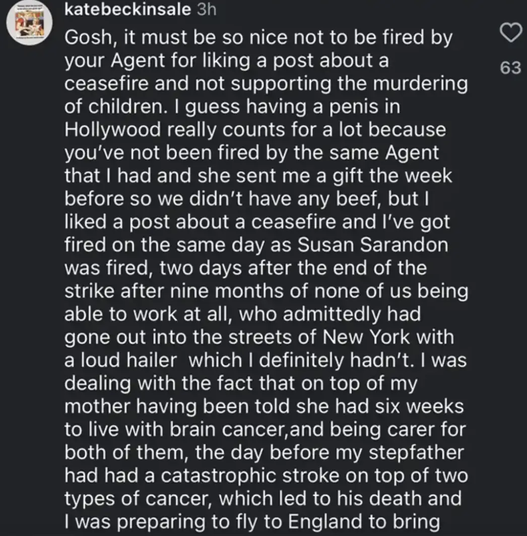 In now-deleted comments obtained by Entertainment Weekly, Beckinsale wrote: "It must be so nice not to be fired by your agent for liking a post about a ceasefire and not supporting the murdering of children."