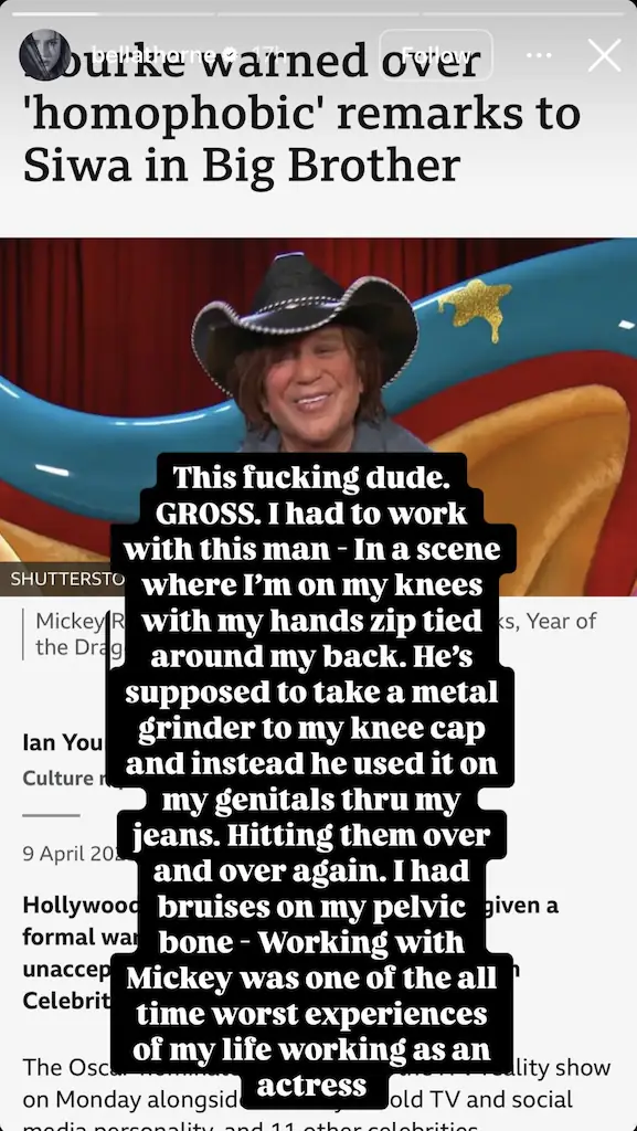 Throne shared the claims on her Instagram Story this week after watching a clip of Rourke’s controversial exchange with JoJo Siwa on Celebrity Big Brother UK.