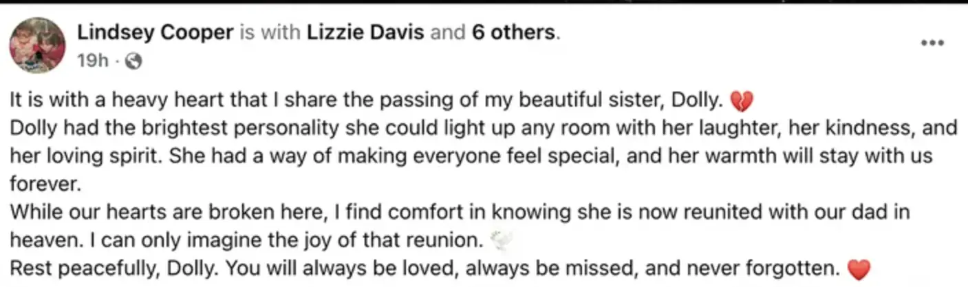 Her sister, Lindsey Cooper, announced the news that her “beautiful sister” with the “brightest personality” had died in a Facebook post on Saturday, April 11.