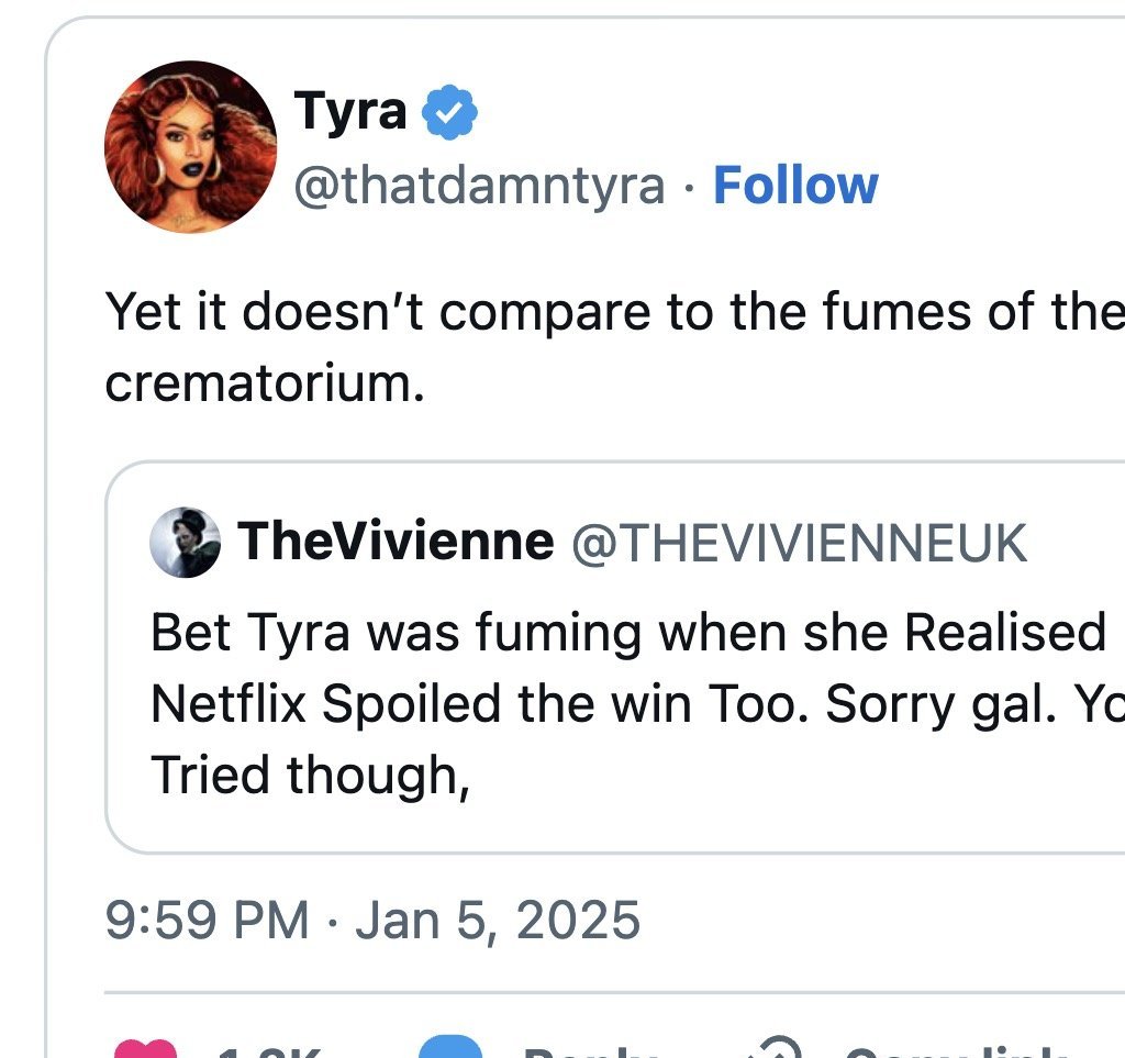 The late drag star's tweet, which was shared in July 2020, read: “Bet Tyra was fuming when she Realised Netflix Spoiled the win Too. Sorry gal. You Tried though."