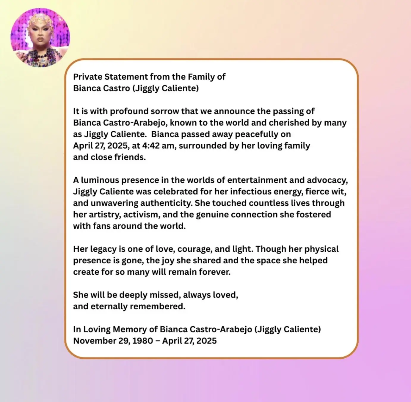 Throughout her career, Jiggly Caliente remained a beacon of positivity, resilience, and pride. Her contributions to both entertainment and advocacy will be remembered by fans and the LGBTQ+ community around the world.