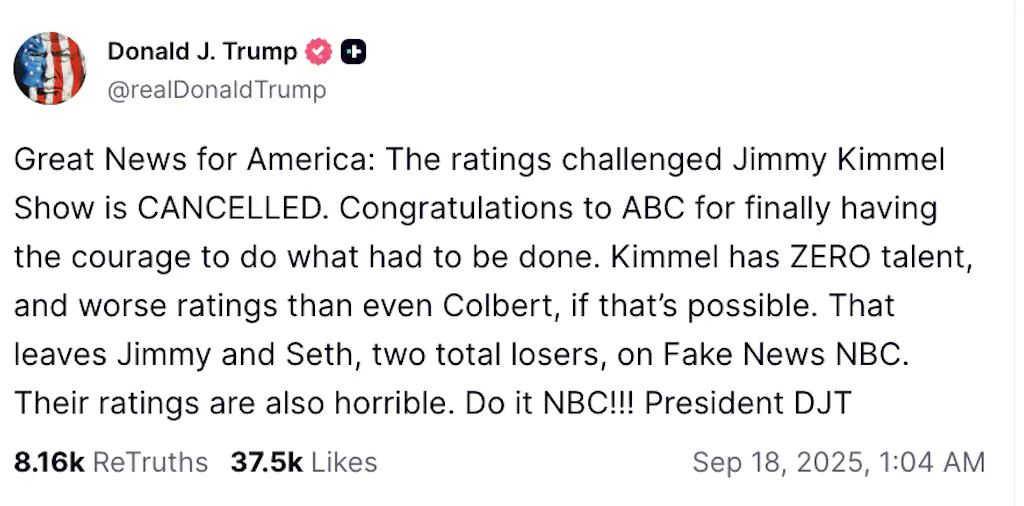 President Donald Trump was quick to respond on Truth Social, writing: “Great News for America: The ratings challenged Jimmy Kimmel Show is CANCELLED.”