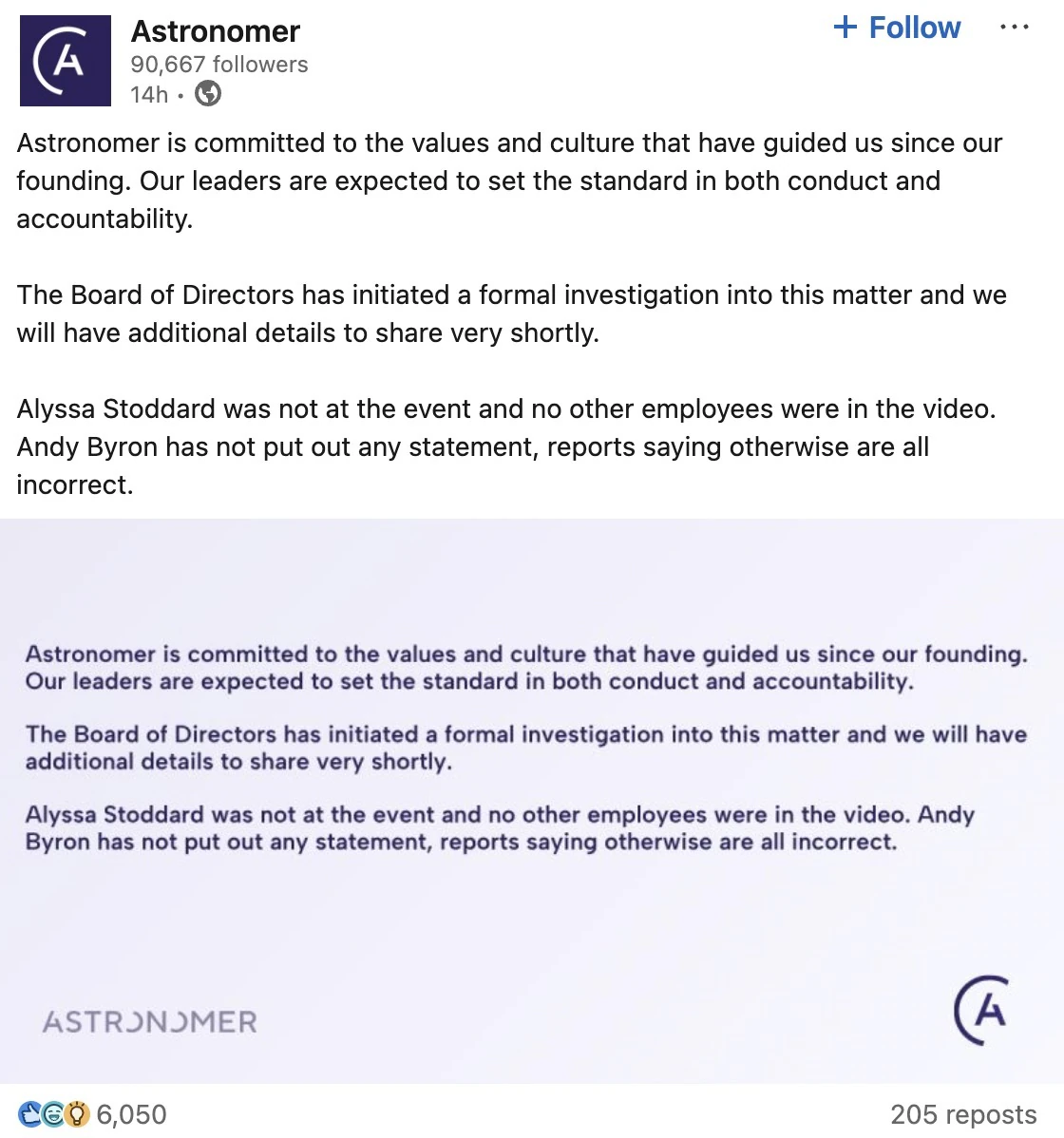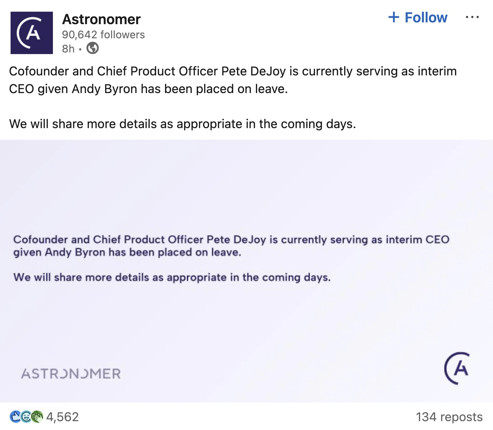 In a statement posted to LinkedIn, the company said: "As stated previously, Astronomer is committed to the values and culture that have guided us since our founding. Our leaders are expected to set the standard in both conduct and accountability, and recently, that standard was not met.