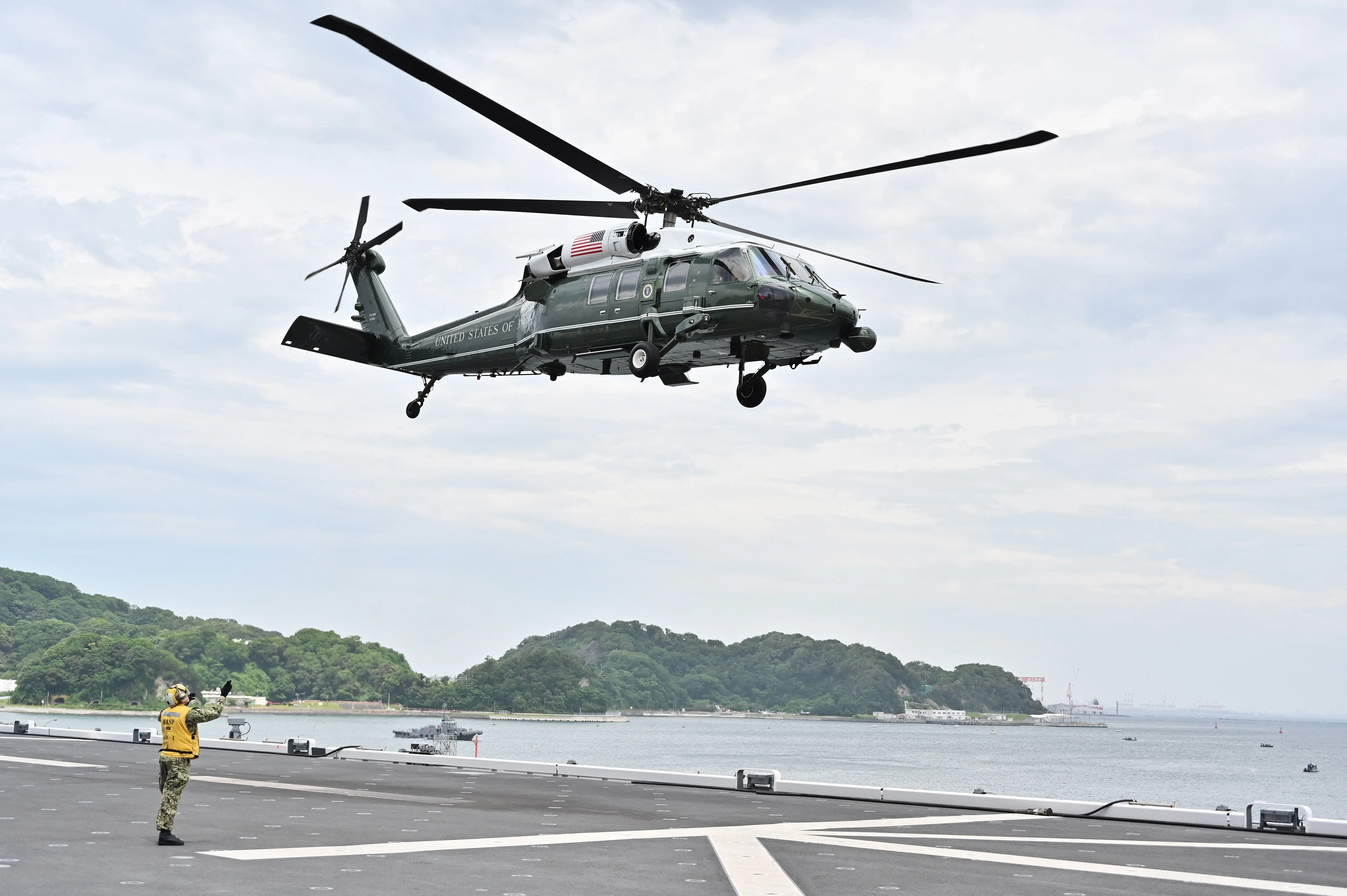 The president will bring a fleet of helicopters with him to the UK. These are collectively referred to, somewhat confusingly, as both Marine One or “white tops”. The president will likely travel in a Sikorsky VH-3D Sea King or a VH-60N White Hawk. The president’s helicopter is usually accompanied by a range of decoys in addition to Osprey MV-22 VTOL (Vertical Take Off and Landing) aircraft - known as “green tops” - which fit somewhere between a helicopter and a plane.