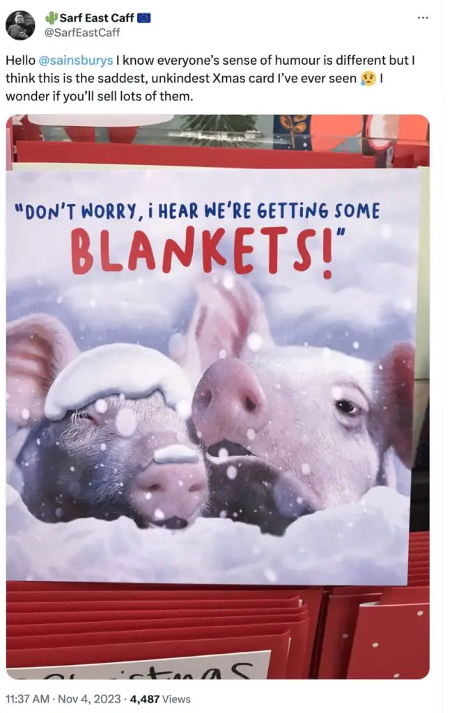 "Hello @sainsburys I know everyone’s sense of humour is different but I think this is the saddest, unkindest Xmas card I’ve ever seen," they wrote. "I wonder if you’ll sell lots of them."