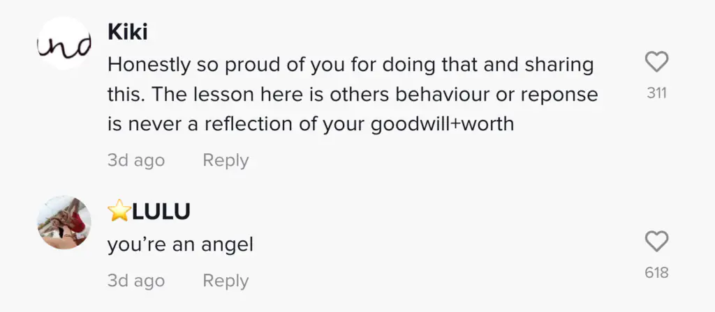 "Honestly so proud of you for doing that and sharing this. The lesson here is others behaviour or response is never a reflection of your goodwill + worth."