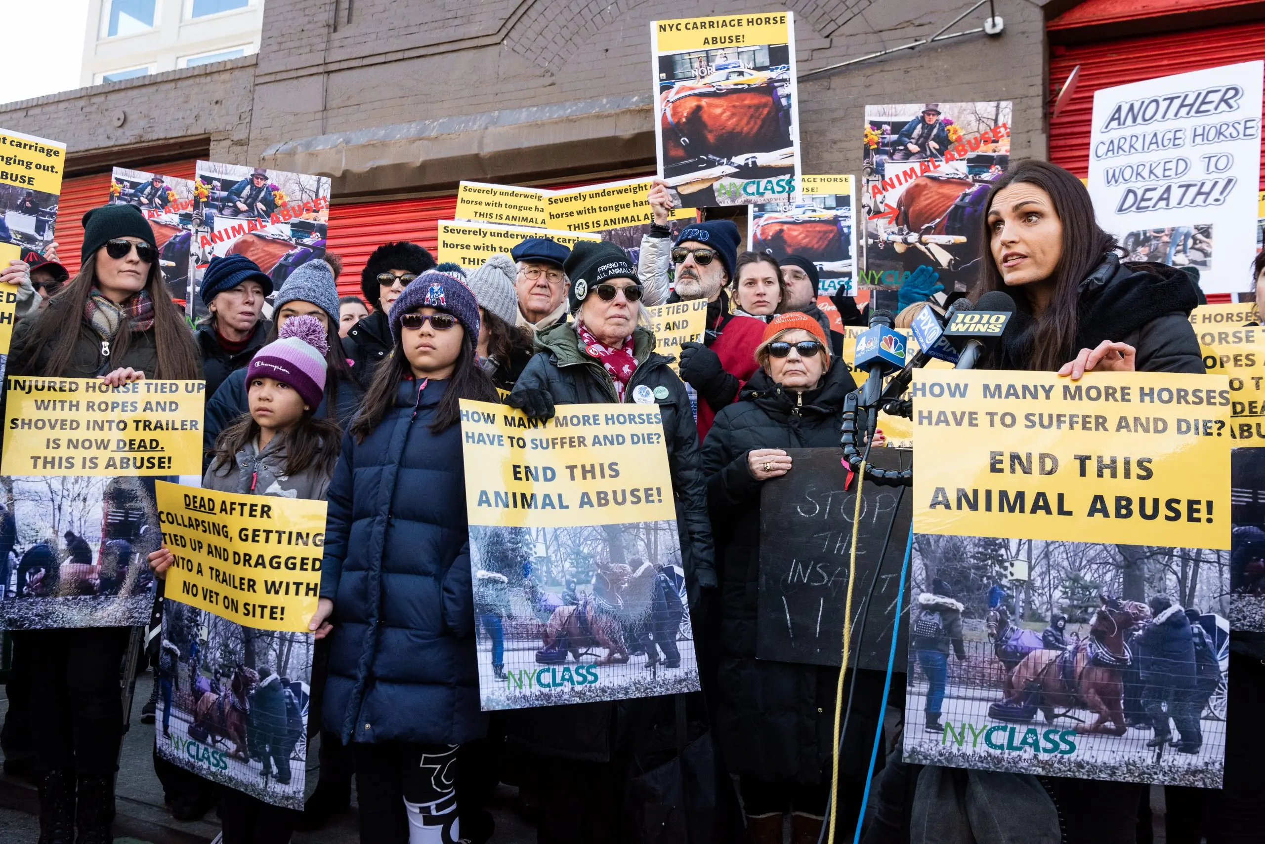 Citizens of New York protested the death of the carriage horse outside the Clinton Park Stable Association yesterday.