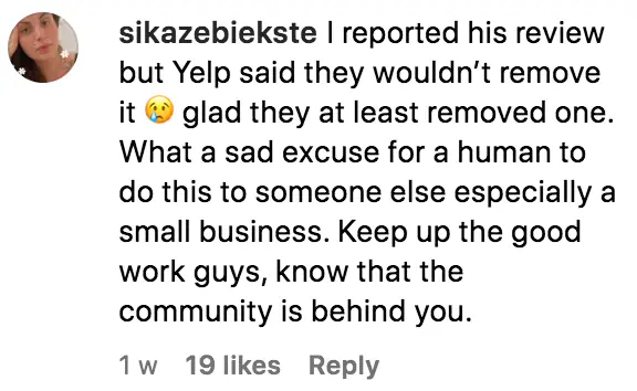 The owners reported the poor review to Yelp and it has now been removed. They wrote in a separate post: "One of the fake sabotaging reviews got removed! Thank you so much for having our back and reporting this person. We are so touched by the overwhelming support of the community!"